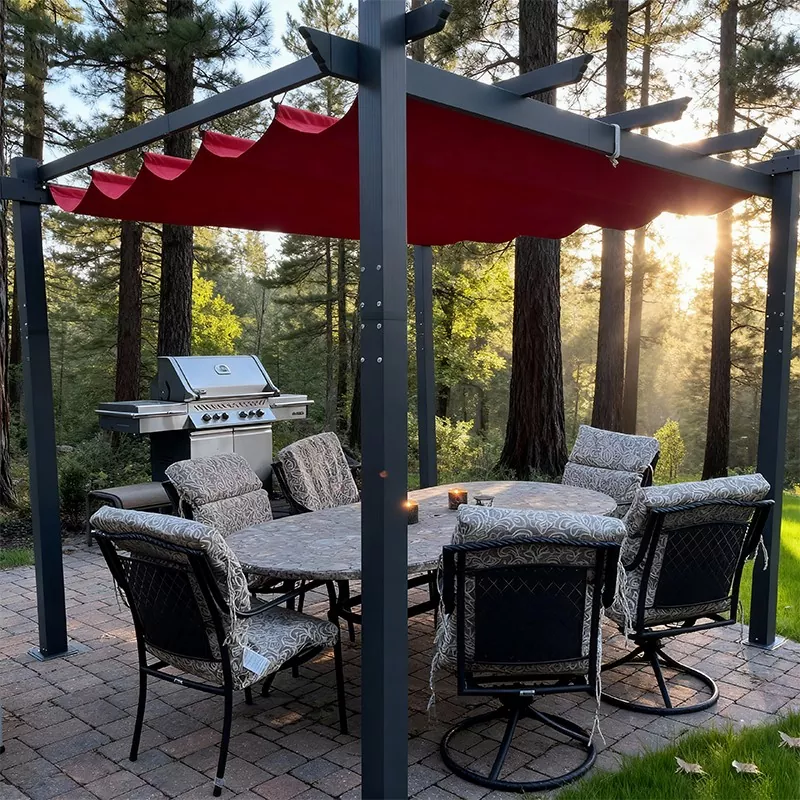 Kuvittele: pihvi sihisee grillissä, ystävät kokoontuvat yhteen juttelemaan ja nauramaan, ja yhtäkkiä taivas verhoutuu tummiin pilviin. Viontan sisään vedettävällä alumiinigrillipergolalla voit avata katon helposti sekunneissa vain kevyellä painalluksella, eristää sadeveden ja varmistaa keskeytymättömät juhlat. Kun auringonvalo on liian voimakas, se tarjoaa täydellisen varjostussuojan, jolloin sinä ja vieraasi voivat nauttia viileästä ja mukavasta ympäristöstä.