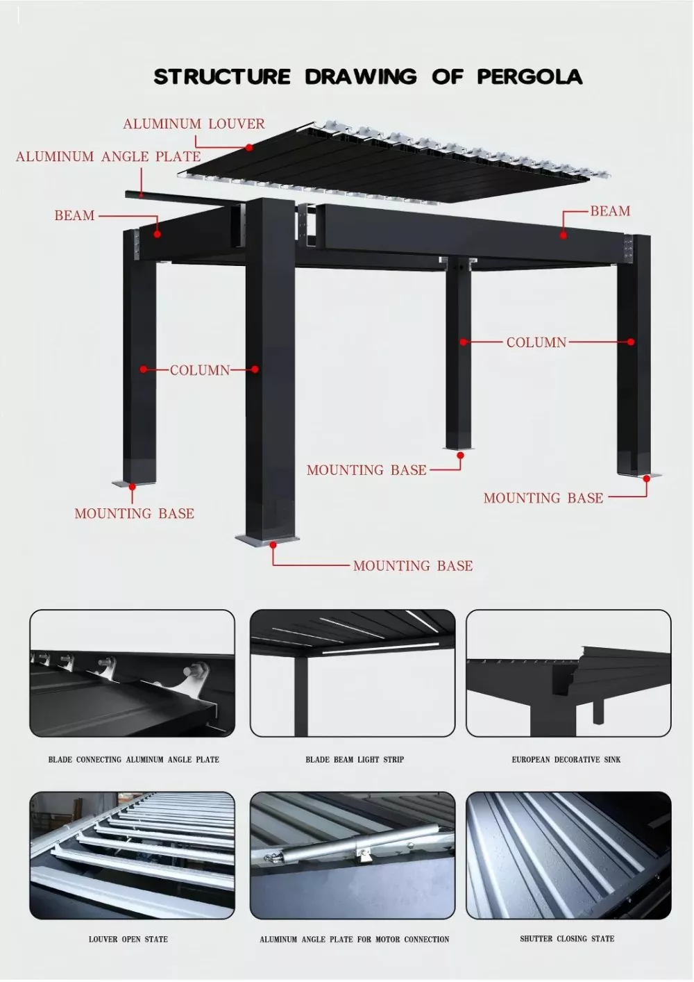 20 vuoden kokemuksella kiinalaisena valmistajana ja toimittajana olemme koonneet useimmin mainitut tekniset tiedot maailmanlaajuisilta asiakkailta ostaessaan Vionta FreestandingiaAlumiininen pergola: